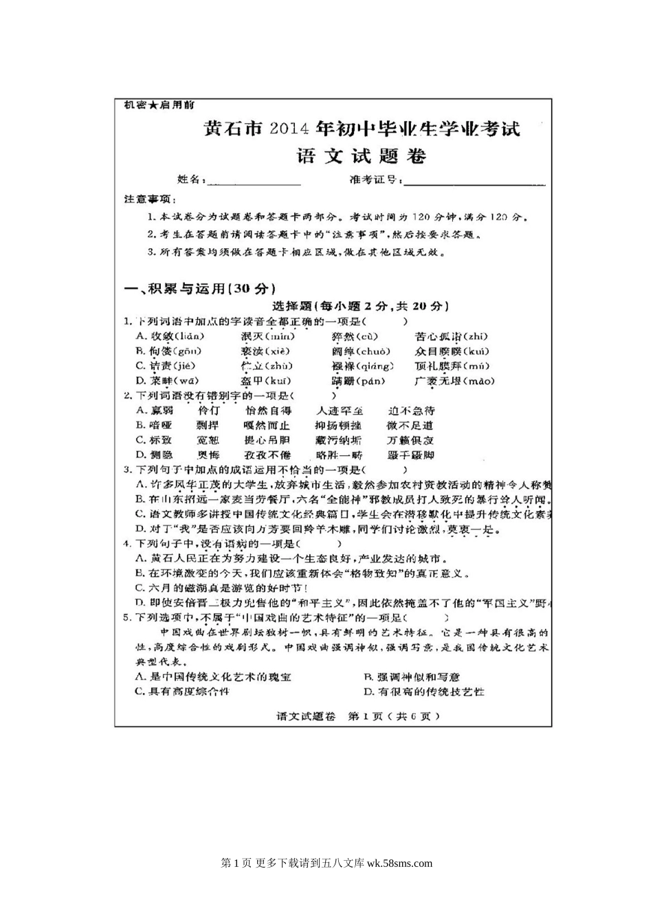 2014年黄石市中考语文试题及答案.doc_第1页