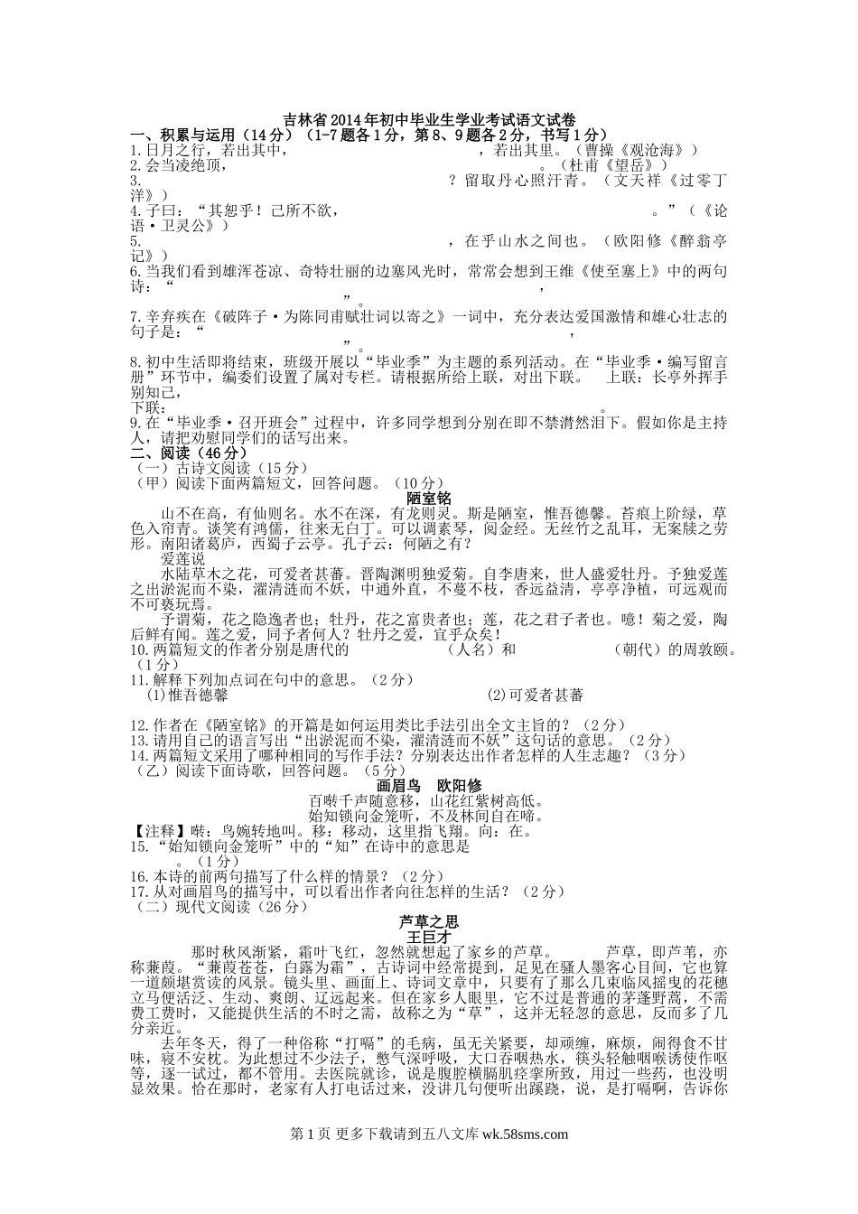 吉林省2014年初中毕业生学业考试语文试卷一、积累与运用(14分)(1-7题各1分,第8、9题各2分,书写1分)1.日月之行,若出其中,,若出其里。(曹操《观沧海》)2.会当凌绝顶,。(杜甫《望岳》)3.?留取丹心照...
