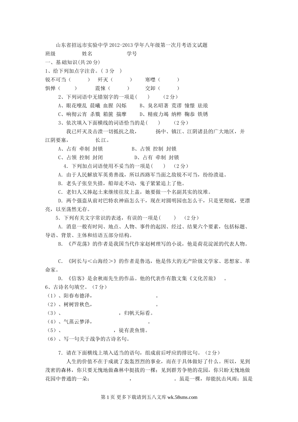 2012-2013学年八年级语文第一次月考卷及答案.doc_第1页