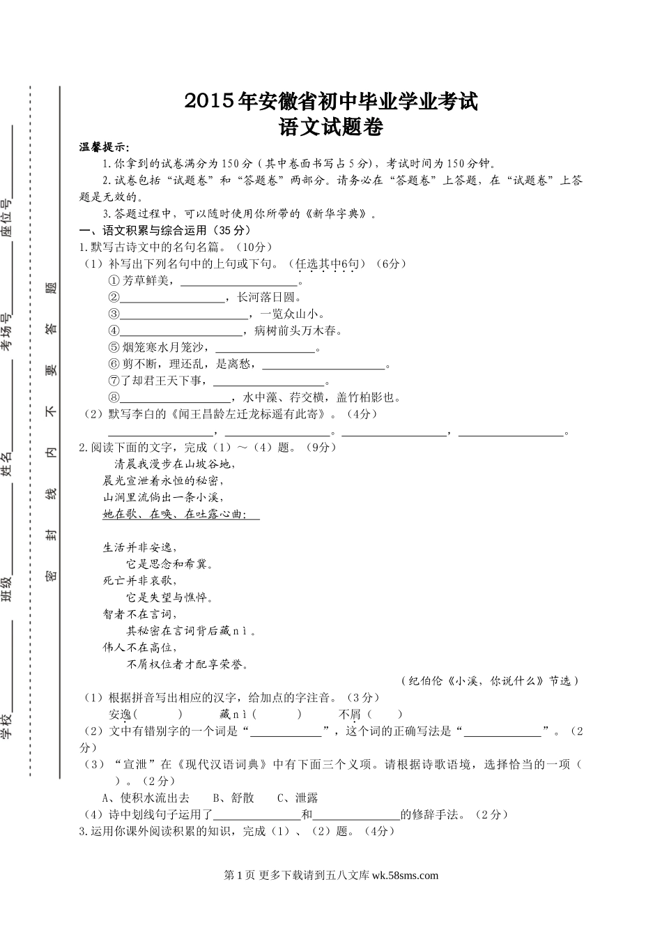 2015年安徽省初中毕业学业考试语文试题卷温馨提示:1.你拿到的试卷满分为150分(其中卷面书写占5分),考试时间为150分钟。2.试卷包括“试题卷”和“答题卷”两部分。请务必在“答题卷”上答题,在“试题卷”上答...