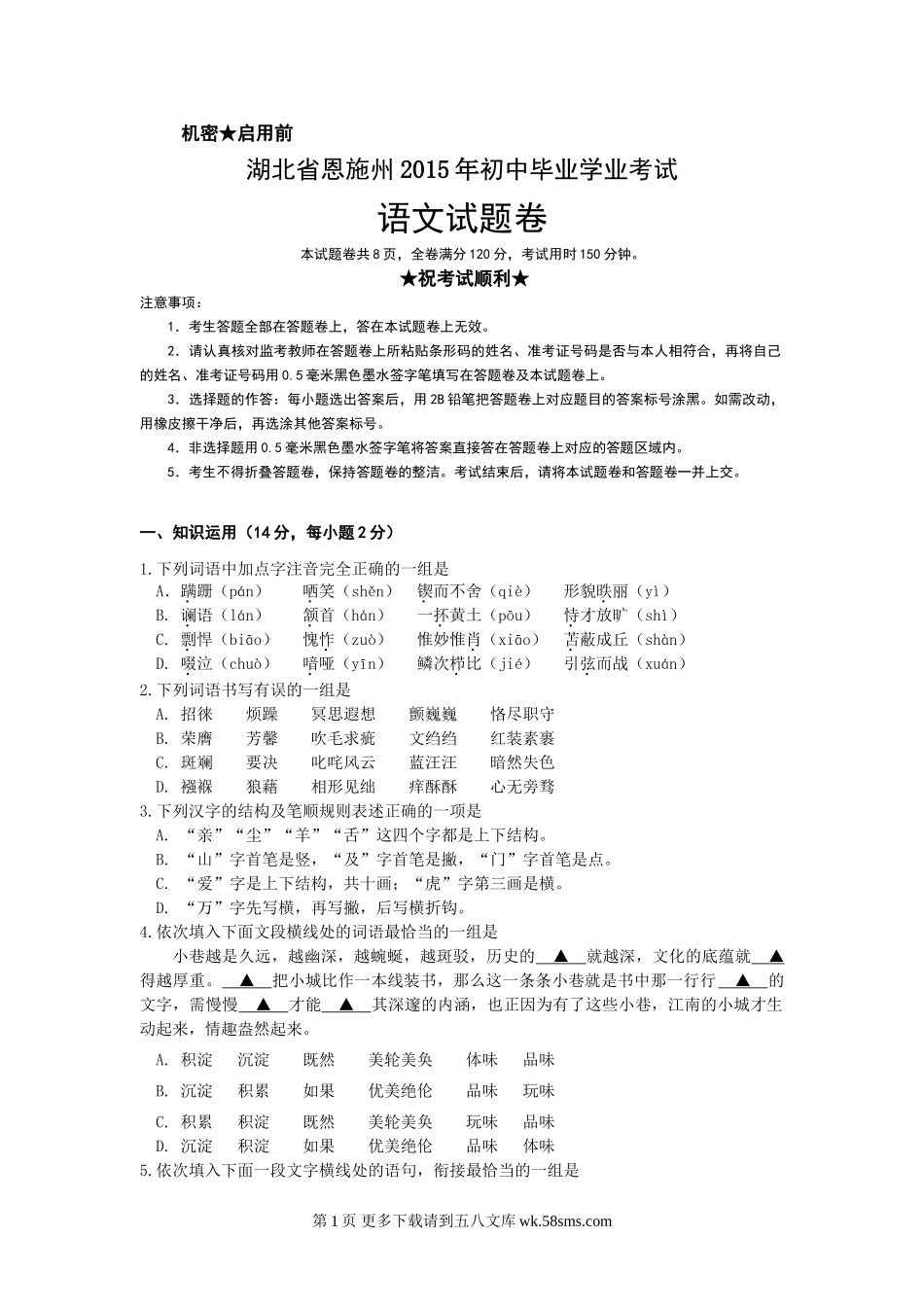 2015年恩施州中考语文试卷及答案.doc_第1页