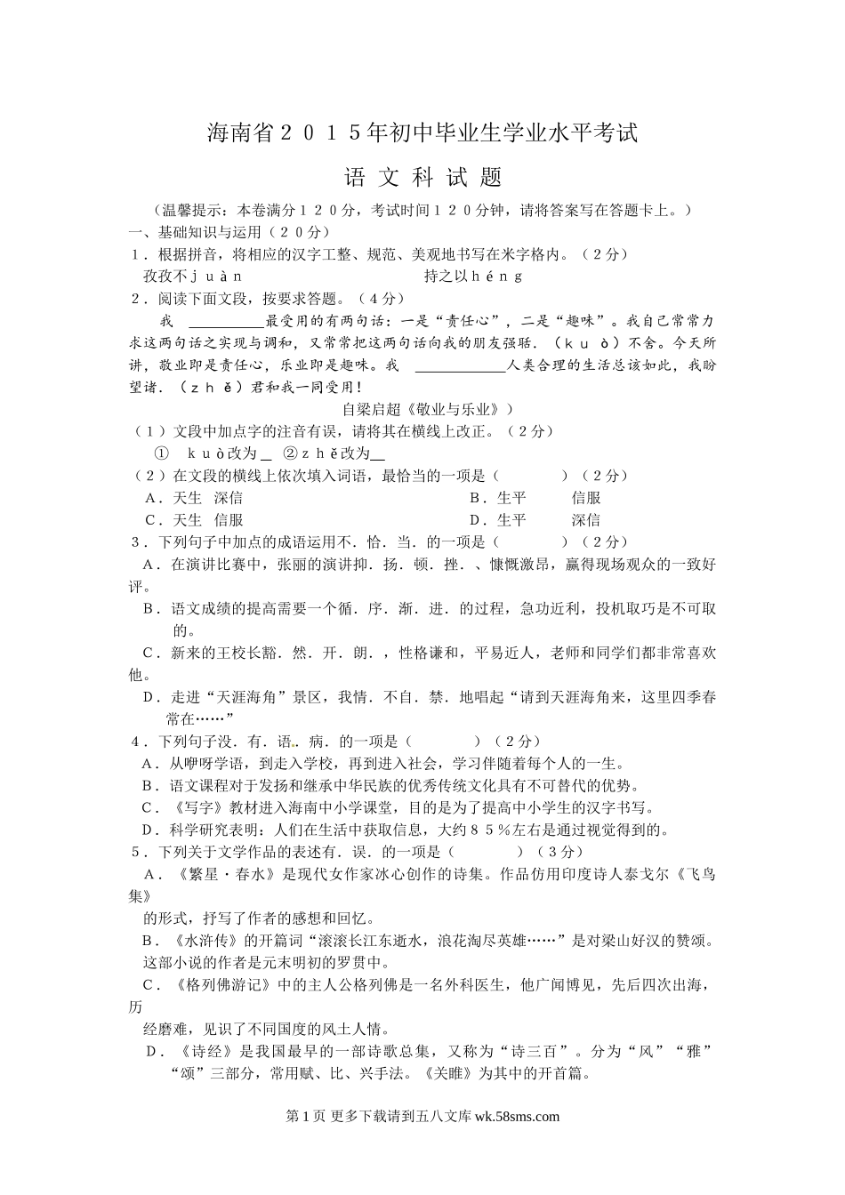 2015年海南省中考语文试卷及答案.doc_第1页