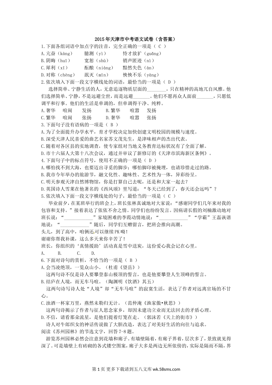 2015年天津市中考语文试卷(含答案)1.下面各组词语中加点字的注音,完全正确的一项是(C)A.亢奋(kàng)臆测(yì)恃才放犷(guǎng)[来源:学|科|网Z|X|X|K]B.阴晦(huǐ)宽恕(shù)销声匿迹(nì)C.犀...