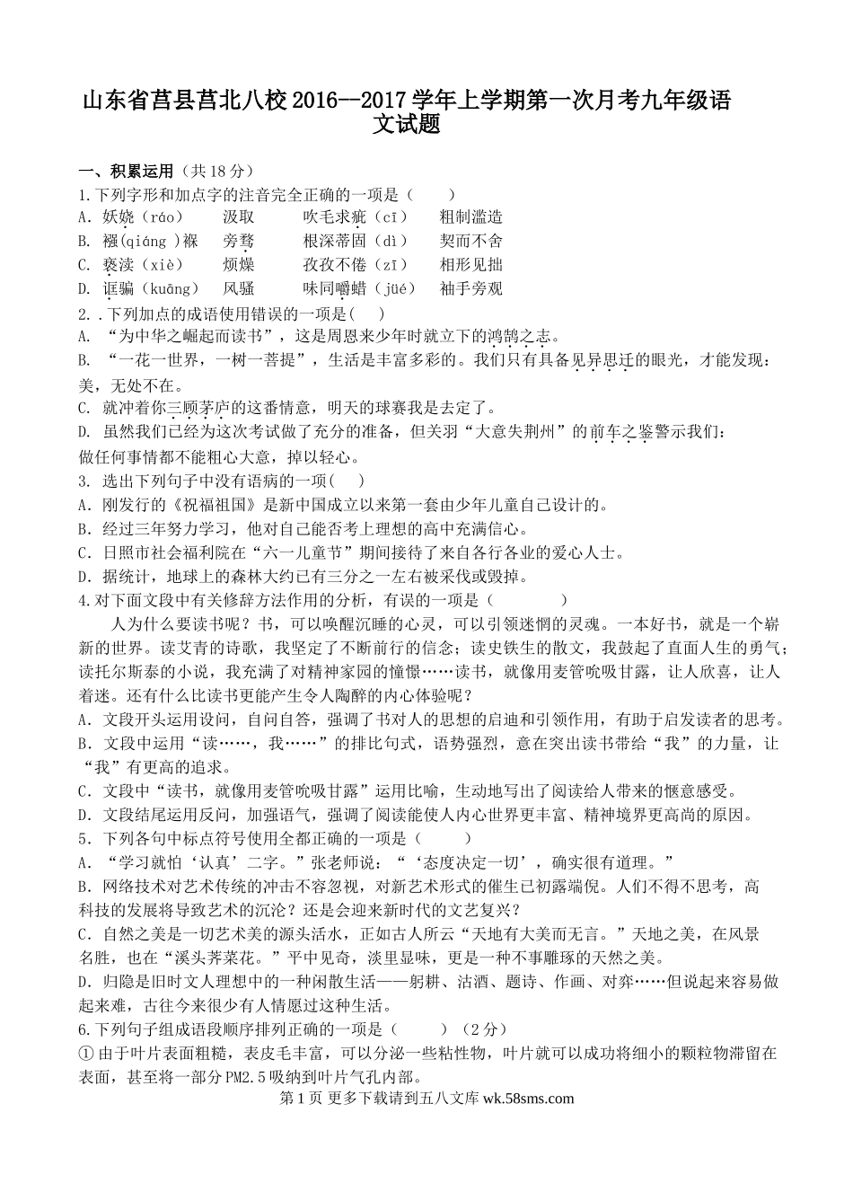 莒北八校2016--2017年九年级语文第一次月考试题及答案.doc_第2页