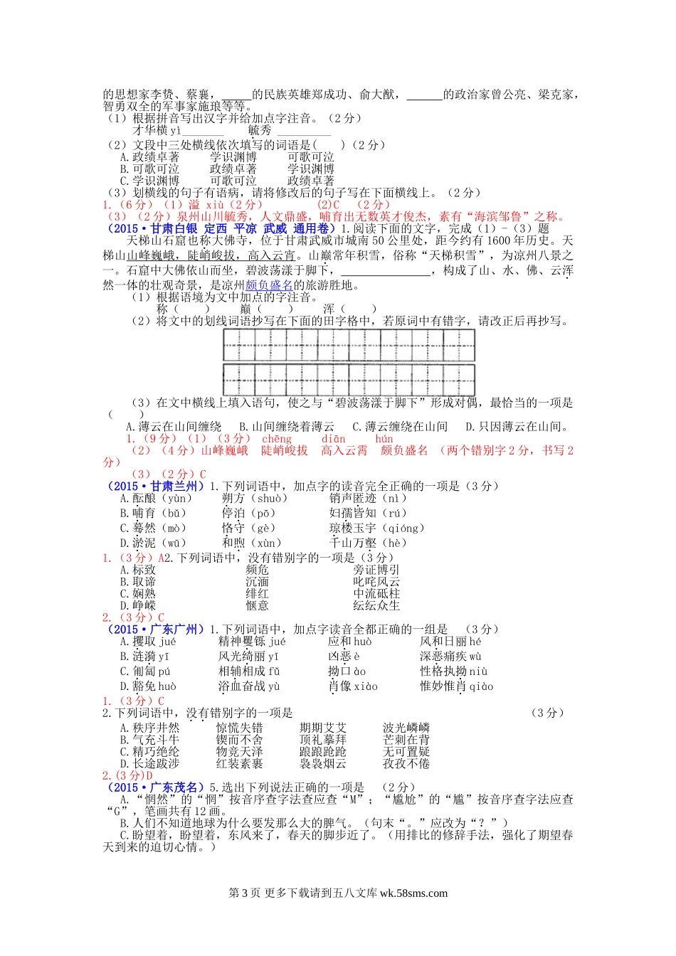 (2015·安徽省卷)2.阅读下面的文字,完成(1)~(4)题。(9分)清晨我漫步在山坡谷地,晨光宣泄着永恒的秘密,山涧里流倘出一条小溪,她在歌、在唤、在吐露心曲:生活并非安逸,它是思念和希冀。死亡并非哀歌...