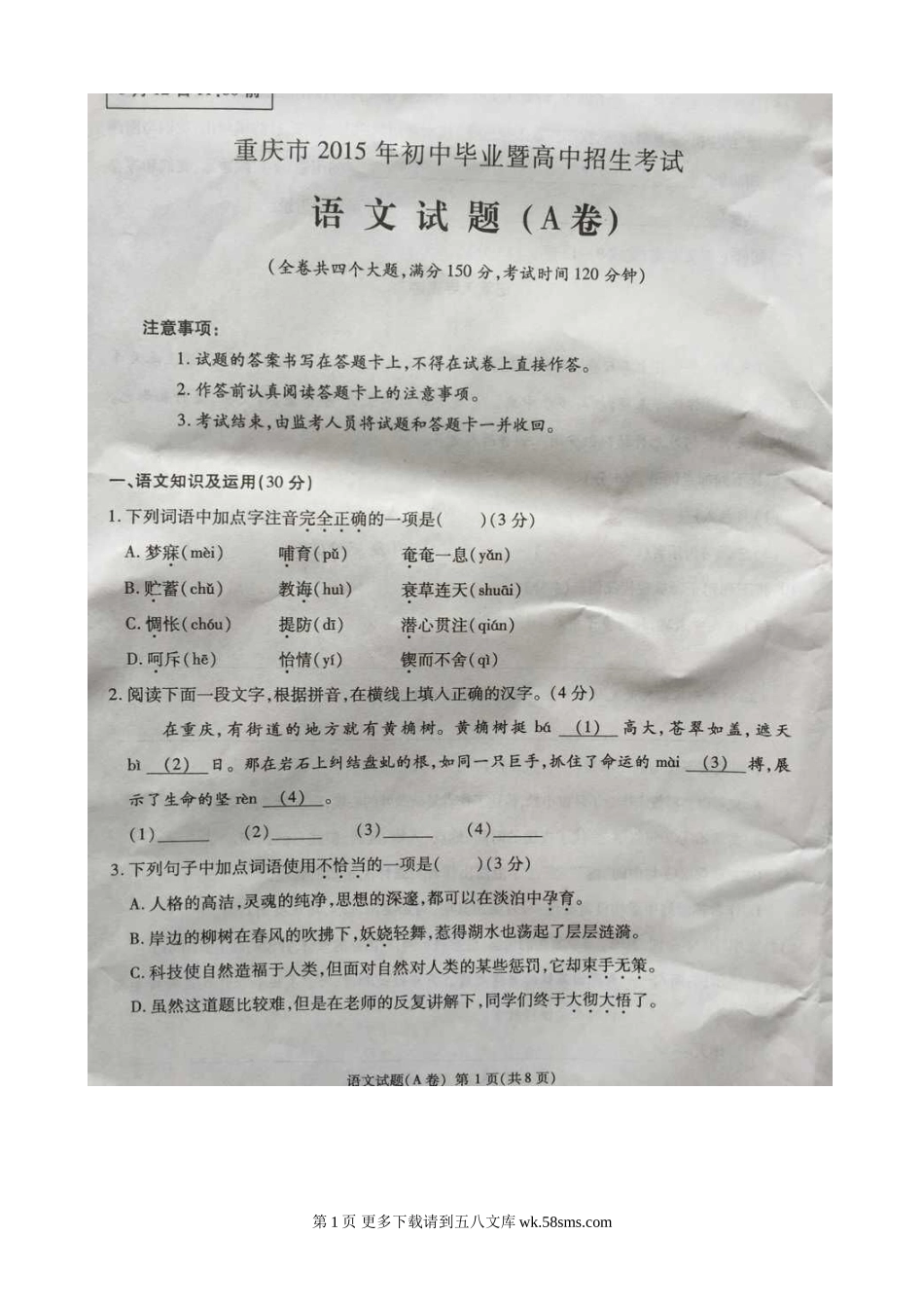 2015年重庆市中考语文试题及答案A卷.doc_第1页