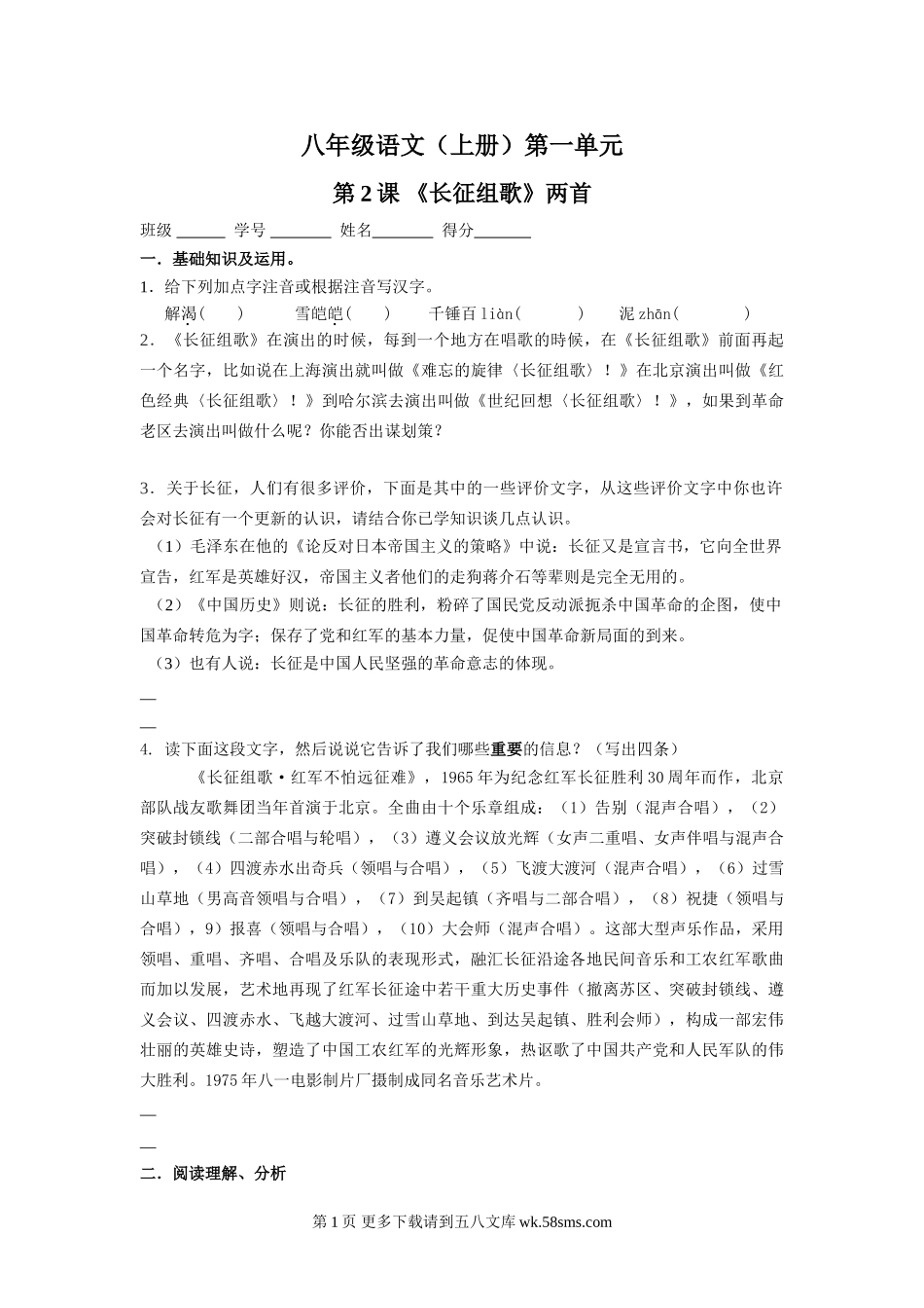 八年级语文《长征组歌》两首练习题及答案.doc_第1页