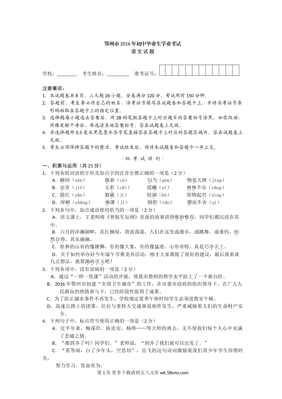 2016年鄂州市中考语文试卷及答案.doc_第1页