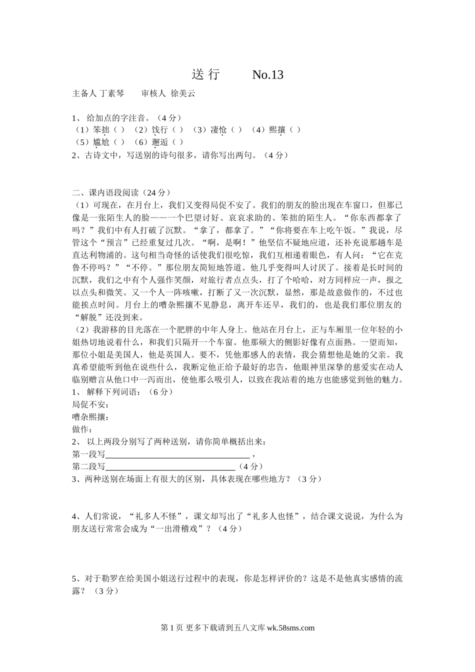 送行No.13主备人丁素琴审核人徐美云1、给加点的字注音。(4分)(1)笨拙()(2)饯行()(3)凄怆()(4)熙攘()(5)尴尬()(6)邂逅()2、古诗文中,写送别的诗句很多,请你写出两句。(4分)二、课内...
