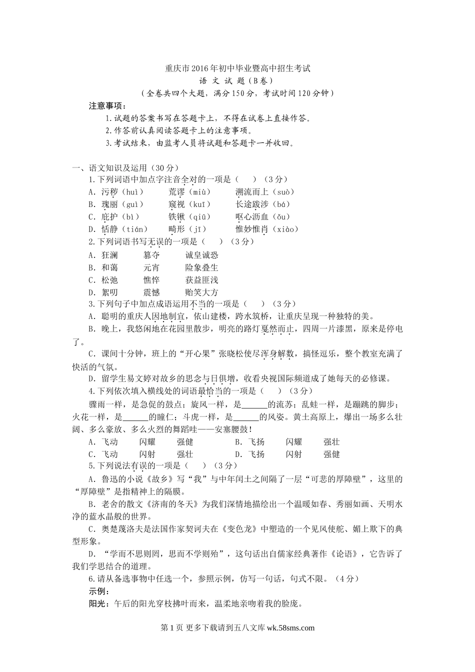 重庆市2016年初中毕业暨高中招生考试语文试题(B卷)(全卷共四个大题,满分150分,考试时间120分钟)注意事项:1.试题的答案书写在答题卡上,不得在试卷上直接作答。2.作答前认真阅读答题卡上的注意事项。3.考试...
