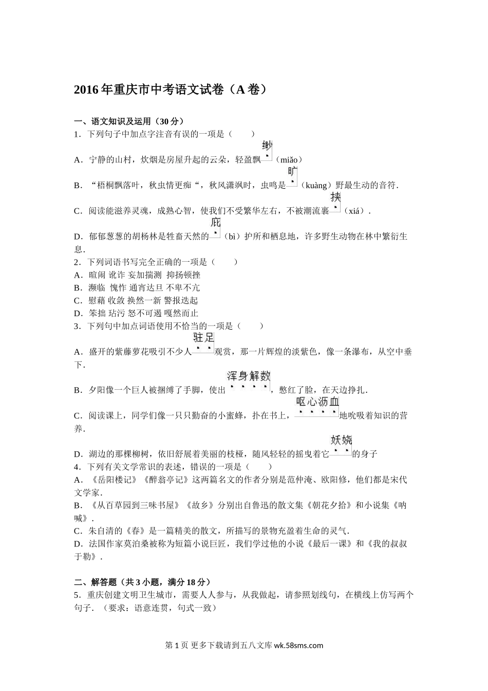 2016年重庆市中考语文试卷(A卷)一、语文知识及运用(30分)1.下列句子中加点字注音有误的一项是()A.宁静的山村,炊烟是房屋升起的云朵,轻盈飘(miǎo)B.“梧桐飘落叶,秋虫情更痴“,秋风潇飒时,虫鸣是...