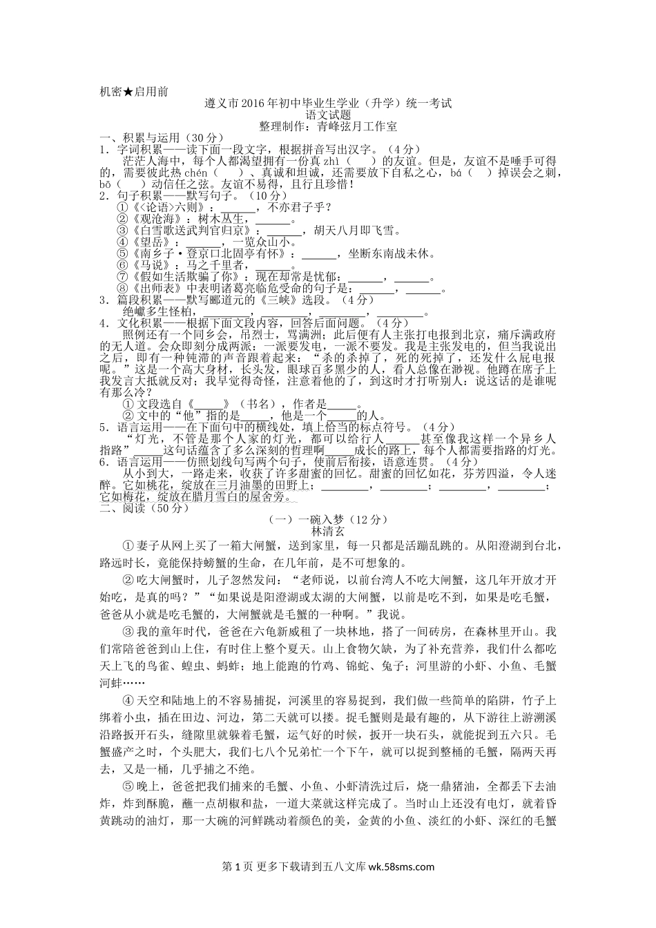 2016年遵义市中考语文试卷及答案.doc_第1页