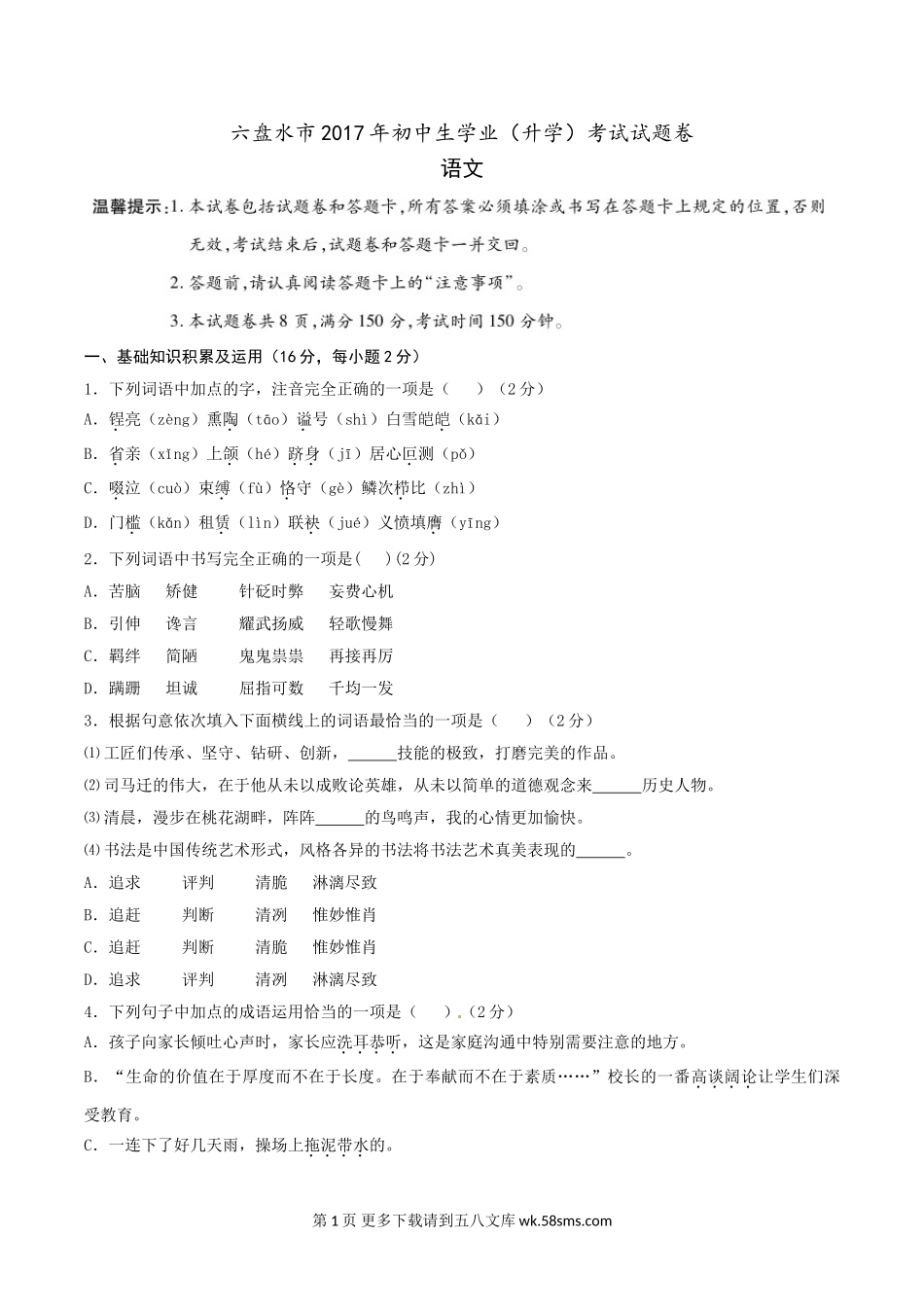 2017年六盘水市中考语文试卷及答案.doc_第1页