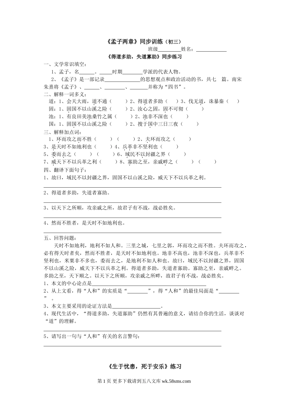 《孟子两章》同步训练(初三)班级姓名:《得道多助,失道寡助》同步练习一、文学常识填空:1、孟子,名。时期学派的代表人物。2、《孟子》是一部记录的思想观点和政治活动的书,共七篇。南宋朱熹将《孟子》、、...
