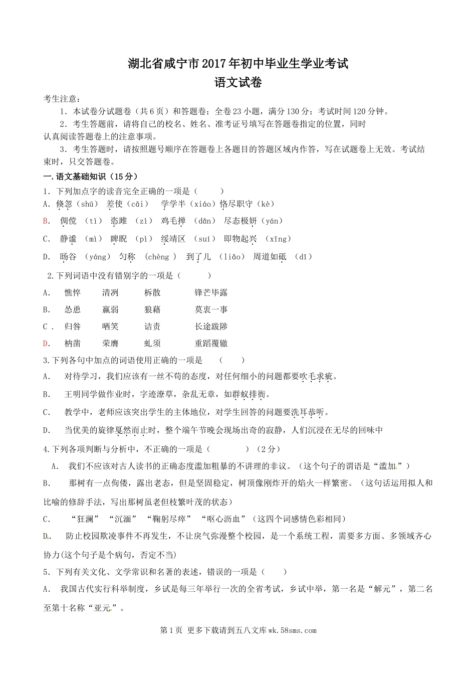 2017年咸宁市中考语文试卷及答案.doc_第1页