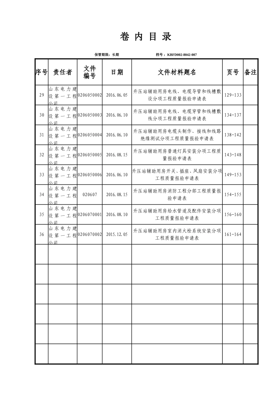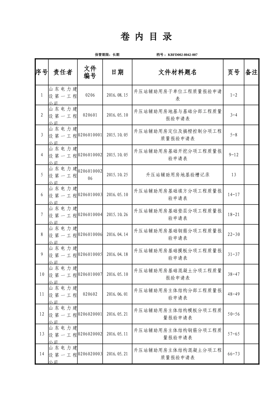 卷内目录保管期限:长期档号:KBFD002-8042-007序号责任者文件编号日期文件材料题名页号备注1山东电力建设第一工程公司02062016.08.15升压站辅助用房子单位工程质量报验申请表1-22山东电力建设第一工程公司020601...