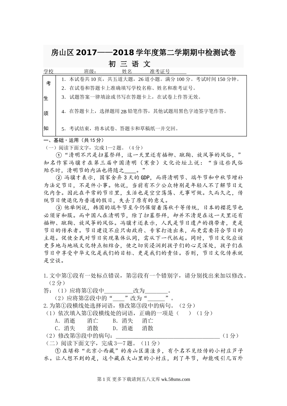 房山区2017——2018学年度第二学期期中检测试卷初三语文学校班级:姓名准考证号考生须知1.本试卷共10页,共五道大题,26道小题。满分100分。考试时间150分钟。2.在试卷和答题卡上准确填写学校名称、姓名和准考...