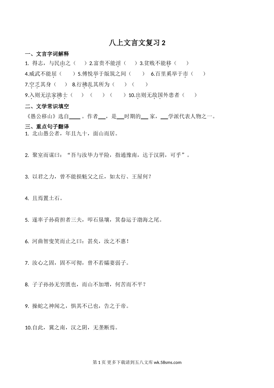 八上文言文复习2一、文言字词解释1.得志,与民由之()2.富贵不能淫()3.贫贱不能移()4.威武不能屈()5.傅悦举于版筑之间()6.百里奚举于市()7.空乏其身()8.行拂乱其所为()()9.入则无法家拂士()(...