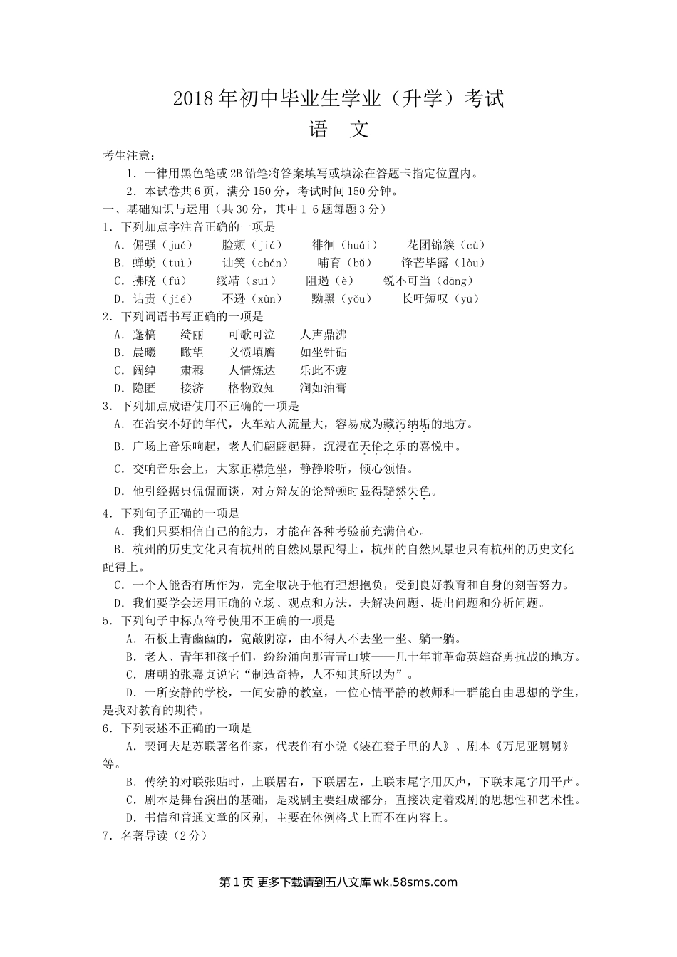 2018年初中毕业生学业(升学)考试语文考生注意:1.一律用黑色笔或2B铅笔将答案填写或填涂在答题卡指定位置内。2.本试卷共6页,满分150分,考试时间150分钟。一、基础知识与运用(共30分,其中1-6题每题3分)1...
