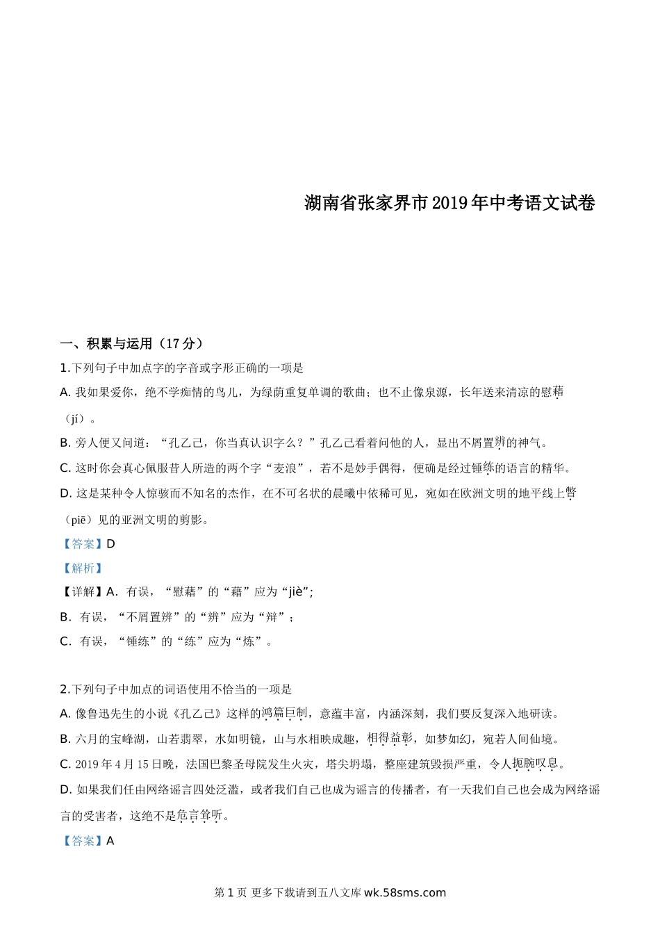 2019年中考真题精品解析 语文(湖南张家界卷)精编word版.doc