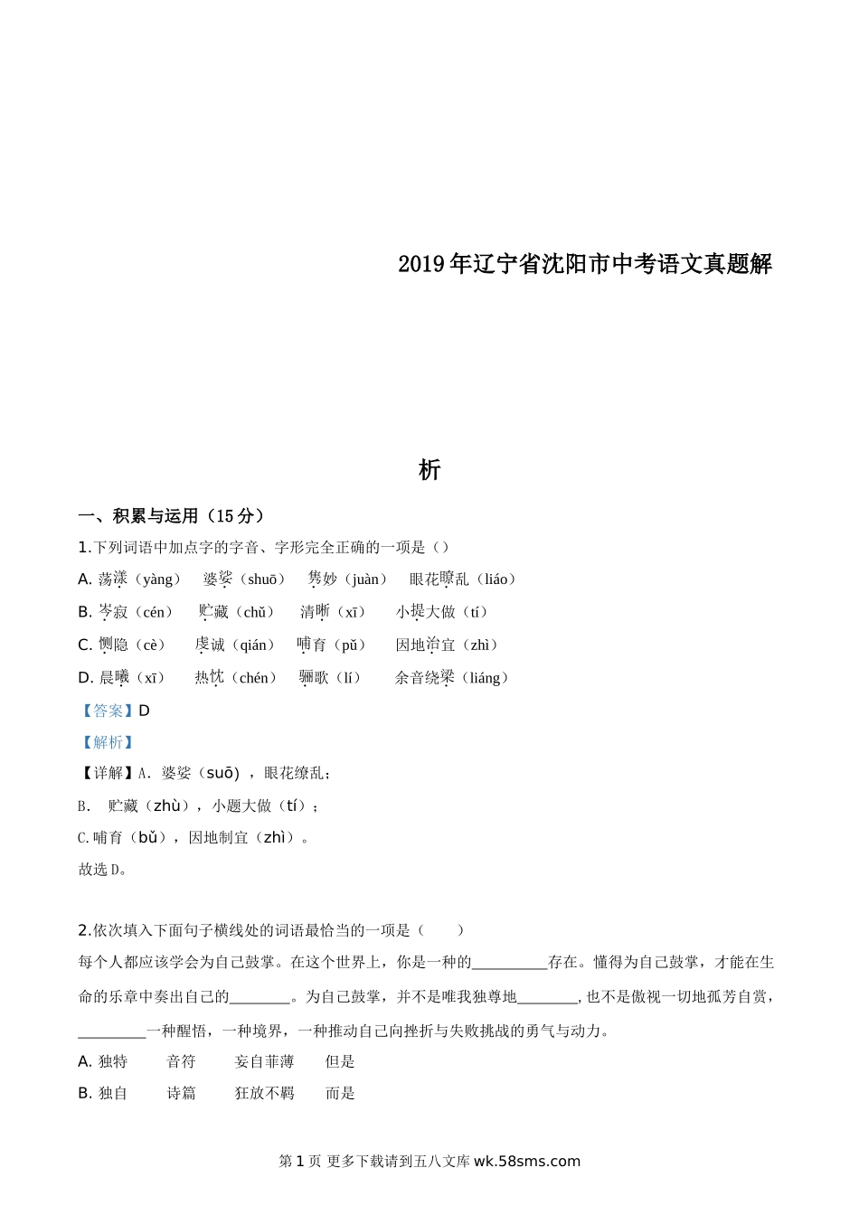 2019年辽宁省沈阳市中考语文真题解析一、积累与运用(15分)1.下列词语中加点字的字音、字形完全正确的一项是()A.荡漾(yàng)婆娑(shuō)隽妙(juàn)眼花瞭乱(liáo)B.岑寂(cén)贮藏(chǔ)清晰(x...