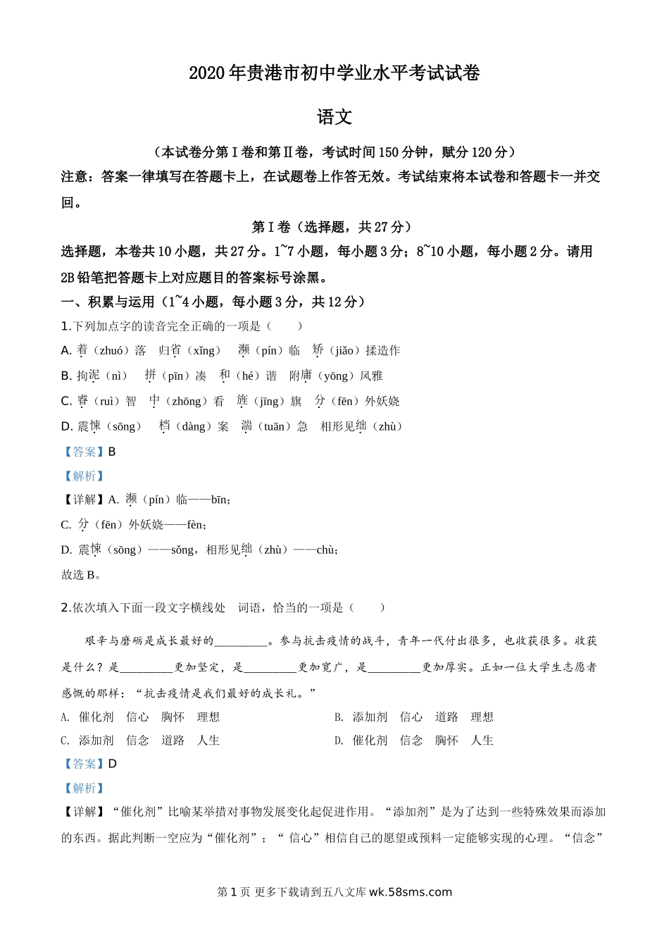 2020年中考真题精品解析 语文(广西贵港卷)精编word版.doc