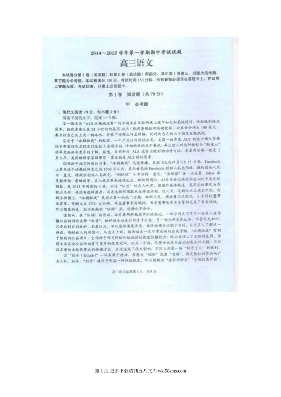 濮阳市油田一中2015届高三上学期语文期中试题及答案.doc_第1页