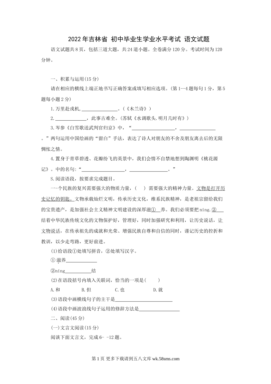 2022年吉林省初中毕业生学业水平考试语文试题语文试题共8页,包括三道大题,共24道小题。全卷满分120分。考试时间为120分钟。一、积累与运用(15分)请在相应的横线上端正地书写正确答案或填写相应选项。(第1--4题...