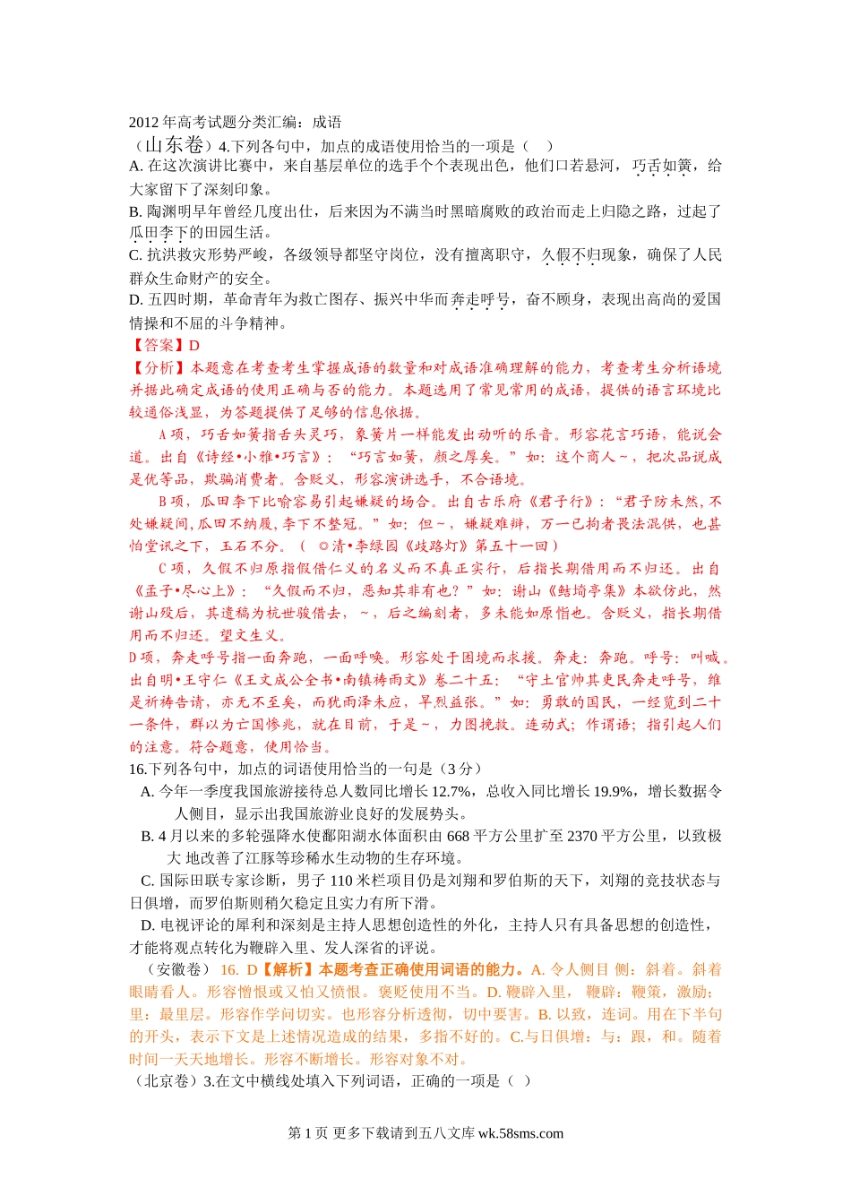 2012年高考语文试题分类汇编:成语(附解析).doc_第1页