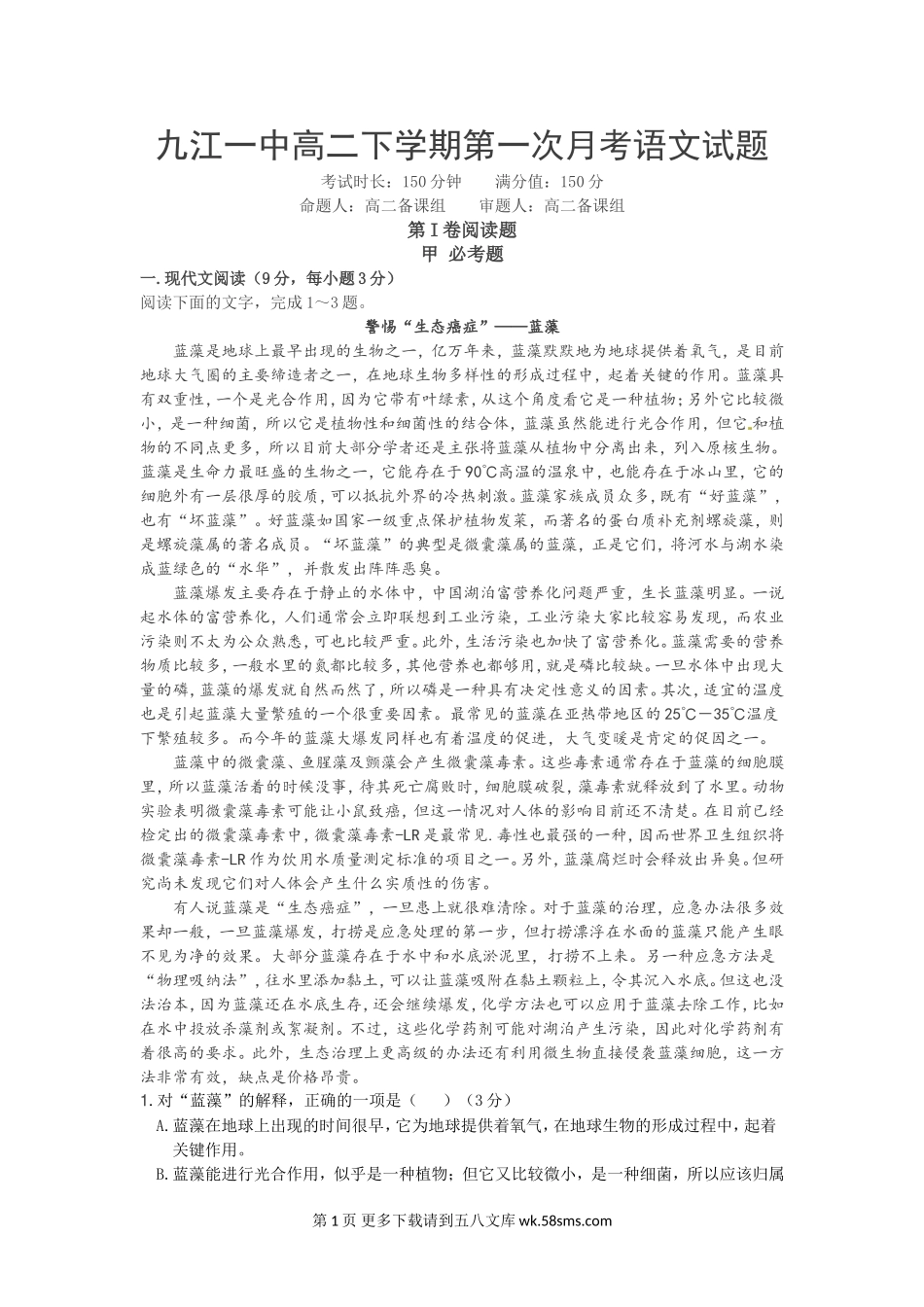 九江一中高二下学期第一次月考语文试题考试时长:150分钟满分值:150分命题人:高二备课组审题人:高二备课组第I卷阅读题甲必考题一.现代文阅读(9分,每小题3分)阅读下面的文字,完成1~3题。警惕“生态癌症”...