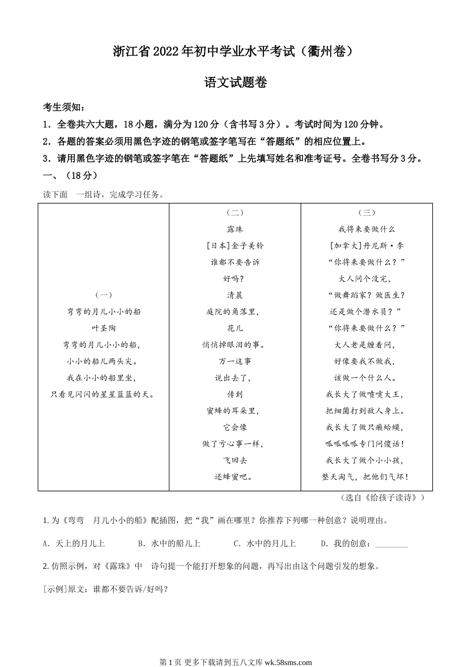 2022年浙江省衢州市中考语文真题(原卷版).doc_第1页