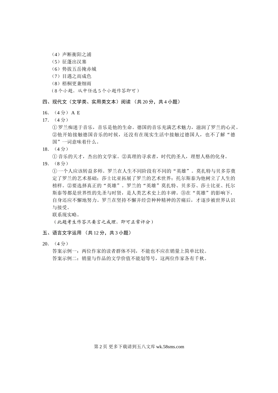 绝密★启用前2013年普通高等学校招生全国统一考试(湖北卷)语文试题参考答案一、语文基础知识(共15分,共5小题,每小题3分)1.A2.C3.D4.B5.B二、现代文(论述类文本)阅读(共9分,共3小题,每小题3分)6...