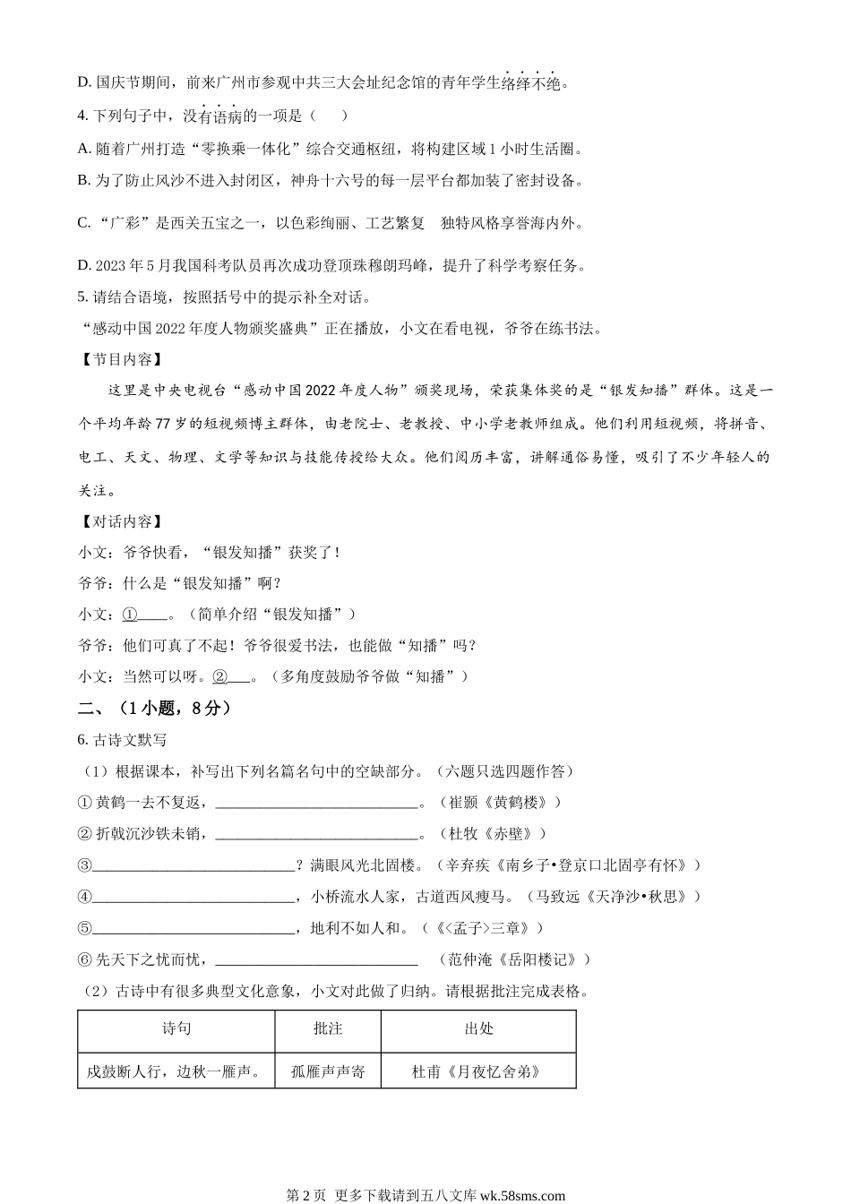 2023年广东省广州市中考语文真题(原卷版).docx_第2页