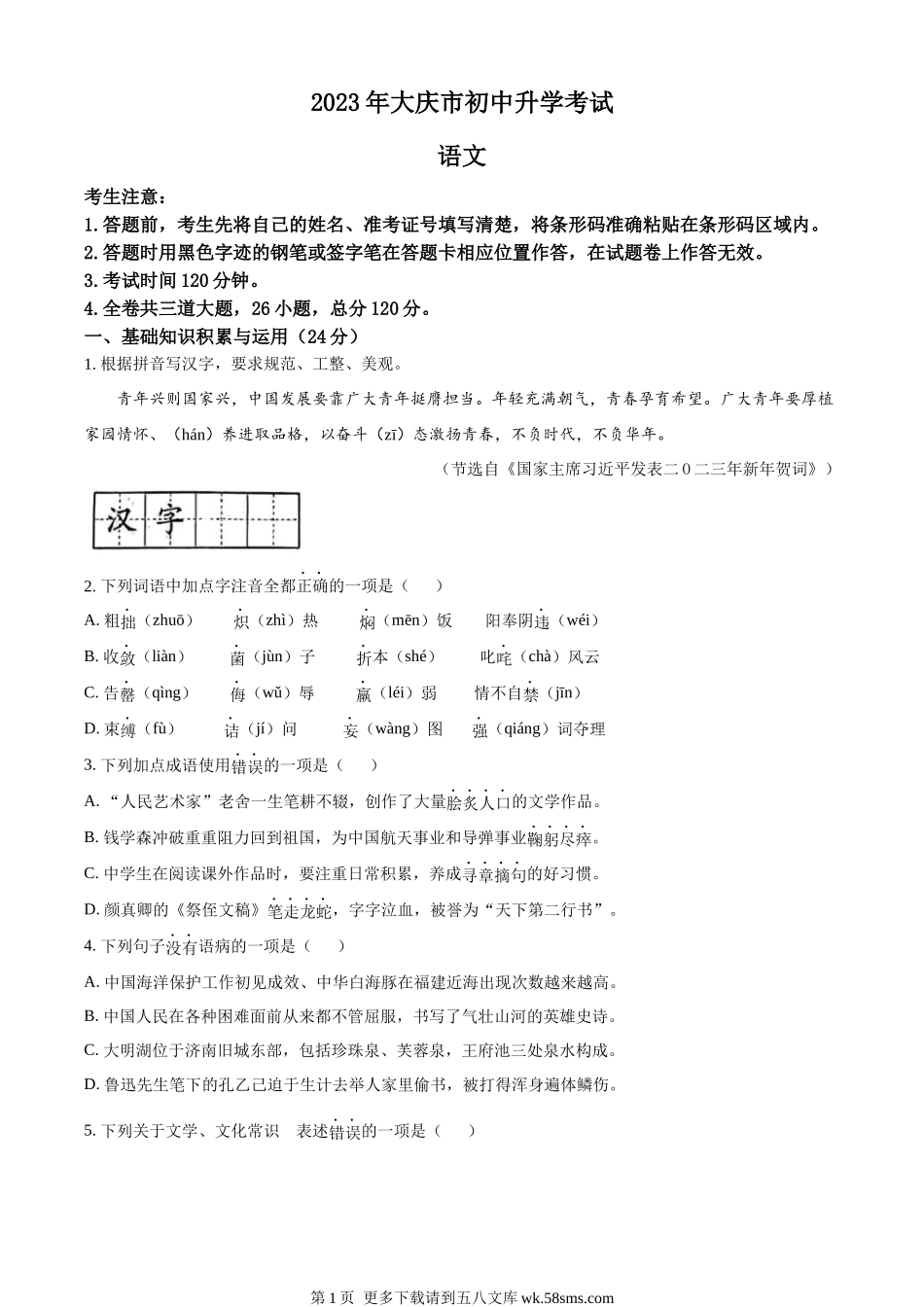 2023年大庆市初中升学考试语文考生注意:1.答题前,考生先将自己的姓名、准考证号填写清楚,将条形码准确粘贴在条形码区域内。2.答题时用黑色字迹的钢笔或签字笔在答题卡相应位置作答,在试题卷上作答无效。3.考...