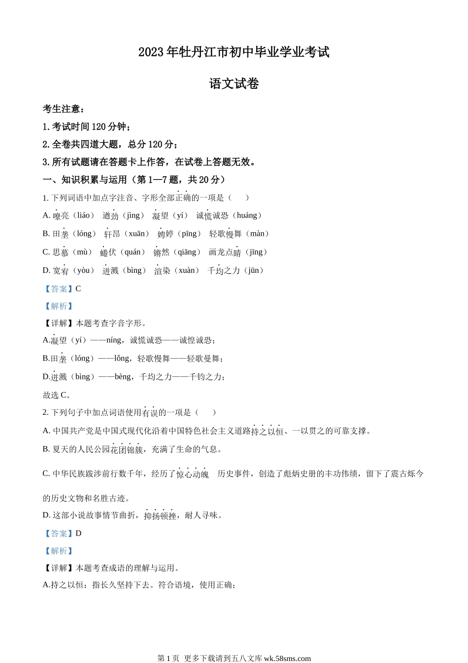 2023年牡丹江市初中毕业学业考试语文试卷考生注意:1.考试时间120分钟;2.全卷共四道大题,总分120分;3.所有试题请在答题卡上作答,在试卷上答题无效。一、知识积累与运用(第1—7题,共20分)1.下列词语中加点...