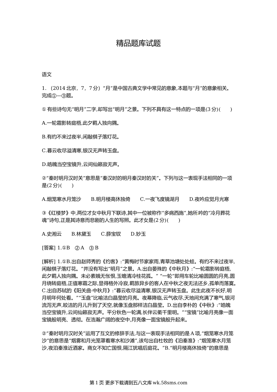 精品题库试题语文1.(2014北京,7,7“”分)月是中国古典文学中常见的意象,“”本题与月的意象相关。—完成①③题。①“”有些诗句无明月二字,“”却写出明月之景。下列不具有这一特点的一项是(3分)()A.一轮霜影...