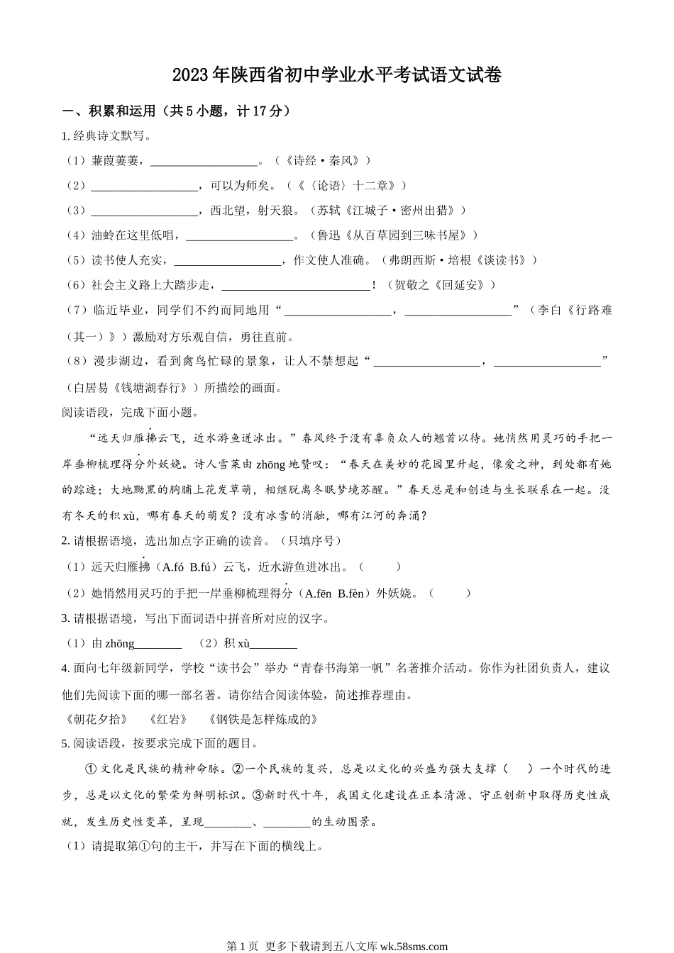 2023年陕西省中考语文真题(原卷版).docx