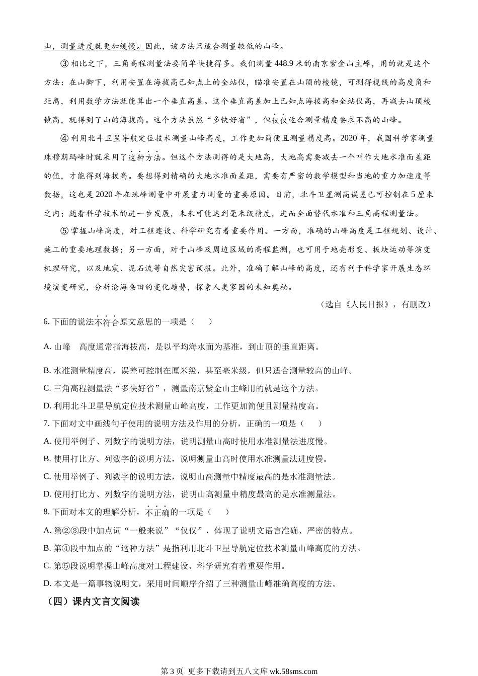 机密★启用前2023年天津市初中学业水平考试试卷语文本试卷分为第I卷(选择题)、第Ⅱ卷(非选择题)两部分。第I卷为第1页至第4页,第Ⅱ卷为第5页至第8页。试卷满分120分。考试时间120分钟。答卷前,请务必将自己...