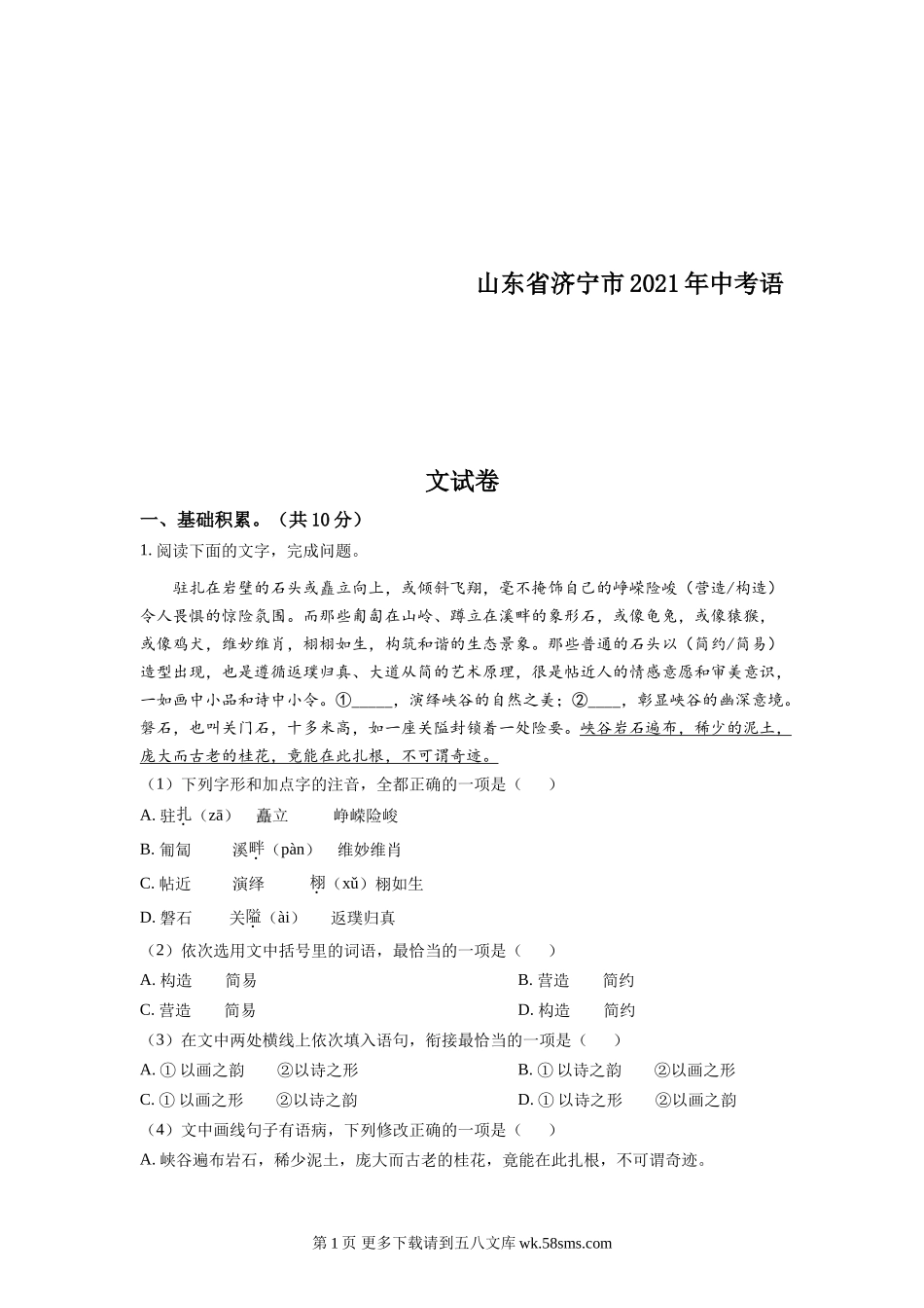 山东省济宁市2021年中考语文试卷一、基础积累。(共10分)1.阅读下面的文字,完成问题。驻扎在岩壁的石头或矗立向上,或倾斜飞翔,毫不掩饰自己的峥嵘险峻(营造/构造)令人畏惧的惊险氛围。而那些匍匐在山岭、蹲...