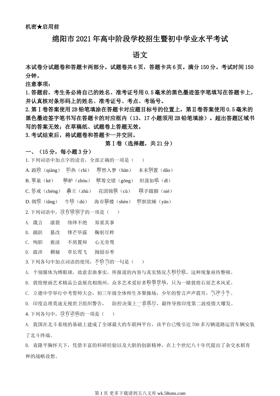 精品解析:四川省绵阳市2021年中考语文试题(原卷版).doc_第1页