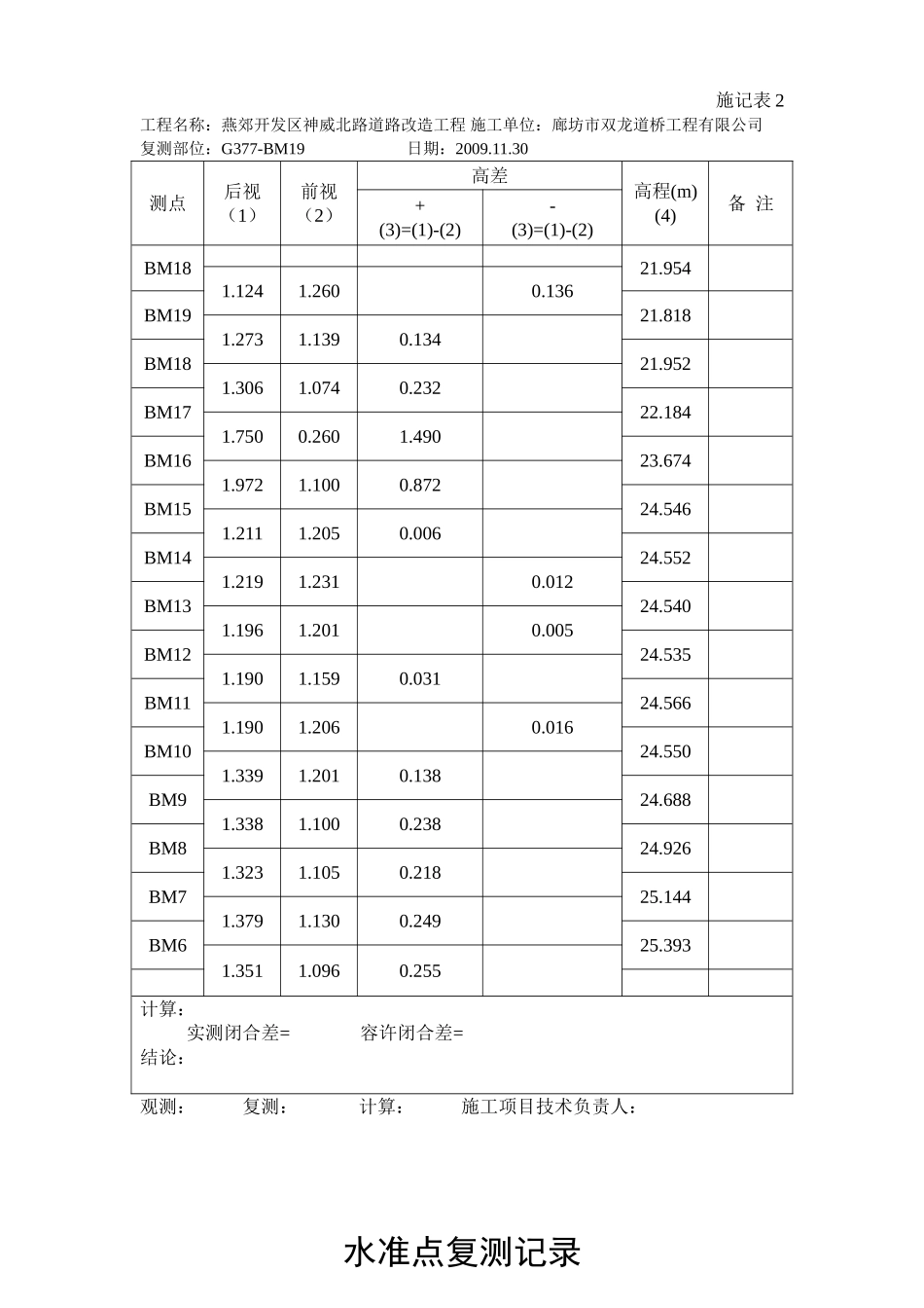 水准点复测记录施记表2工程名称:燕郊开发区神威北路道路改造工程施工单位:廊坊市双龙道桥工程有限公司复测部位:G377-BM1日期:2009.11.30测点后视(1)前视(2)高差高程(m)(4)备注+(3)=(1)-(2)-(3)=(1)-(2)G3...