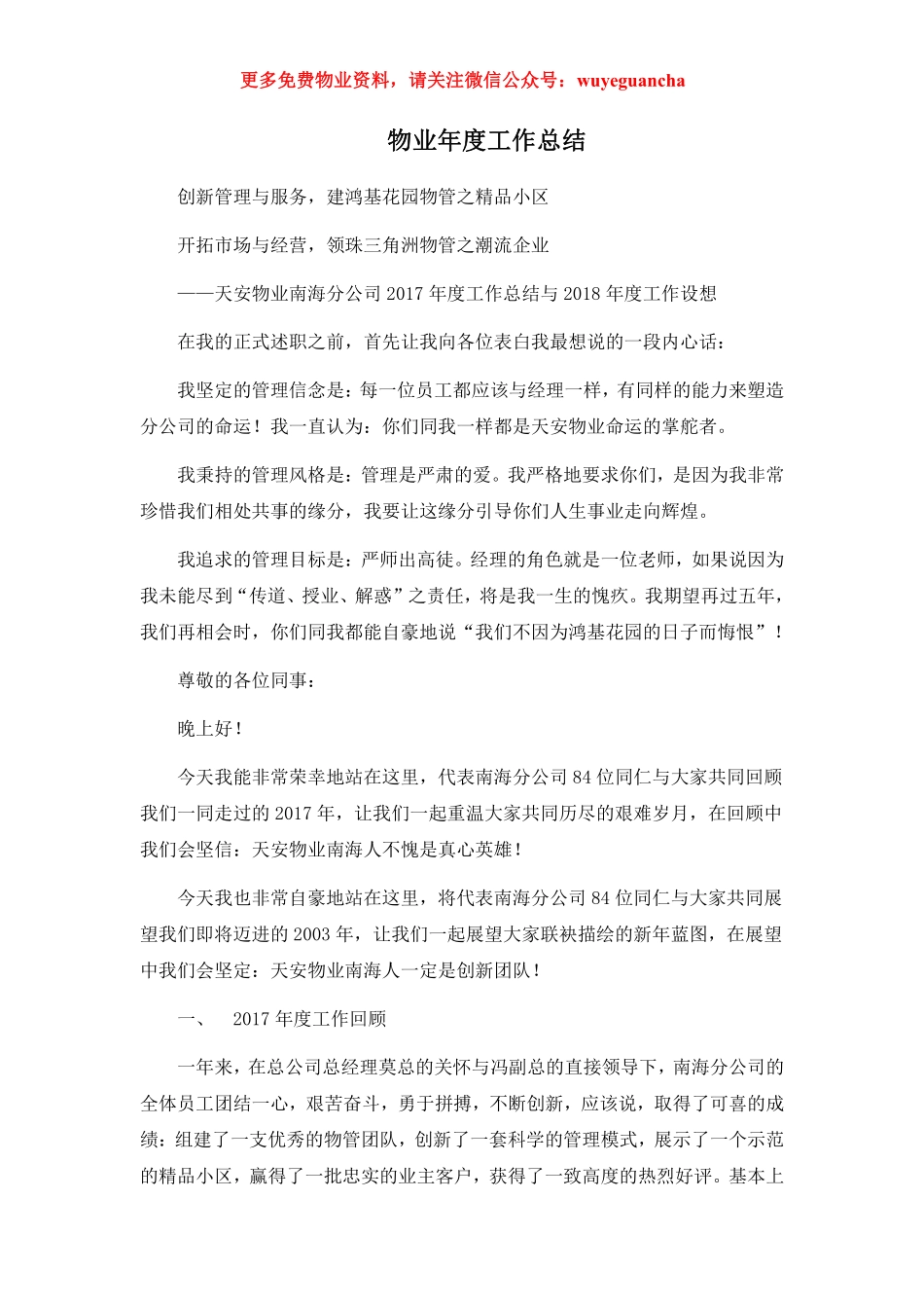 更多免费物业资料,请关注微信公众号:wuyeguancha物业年度工作总结创新管理与服务,建鸿基花园物管之精品小区开拓市场与经营,领珠三角洲物管之潮流企业——天安物业南海分公司2017年度工作总结与2018年度工作设...