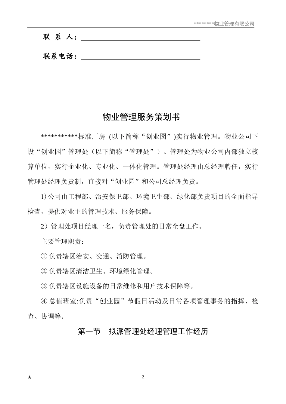 ********物业管理有限公司**********厂区物业服务方案单位名称:地址:★1********物业管理有限公司联系人:联系电话:物业管理服务策划书***********标准厂房(以下简称“创业园”)实行物业管理。物业公司下设“...