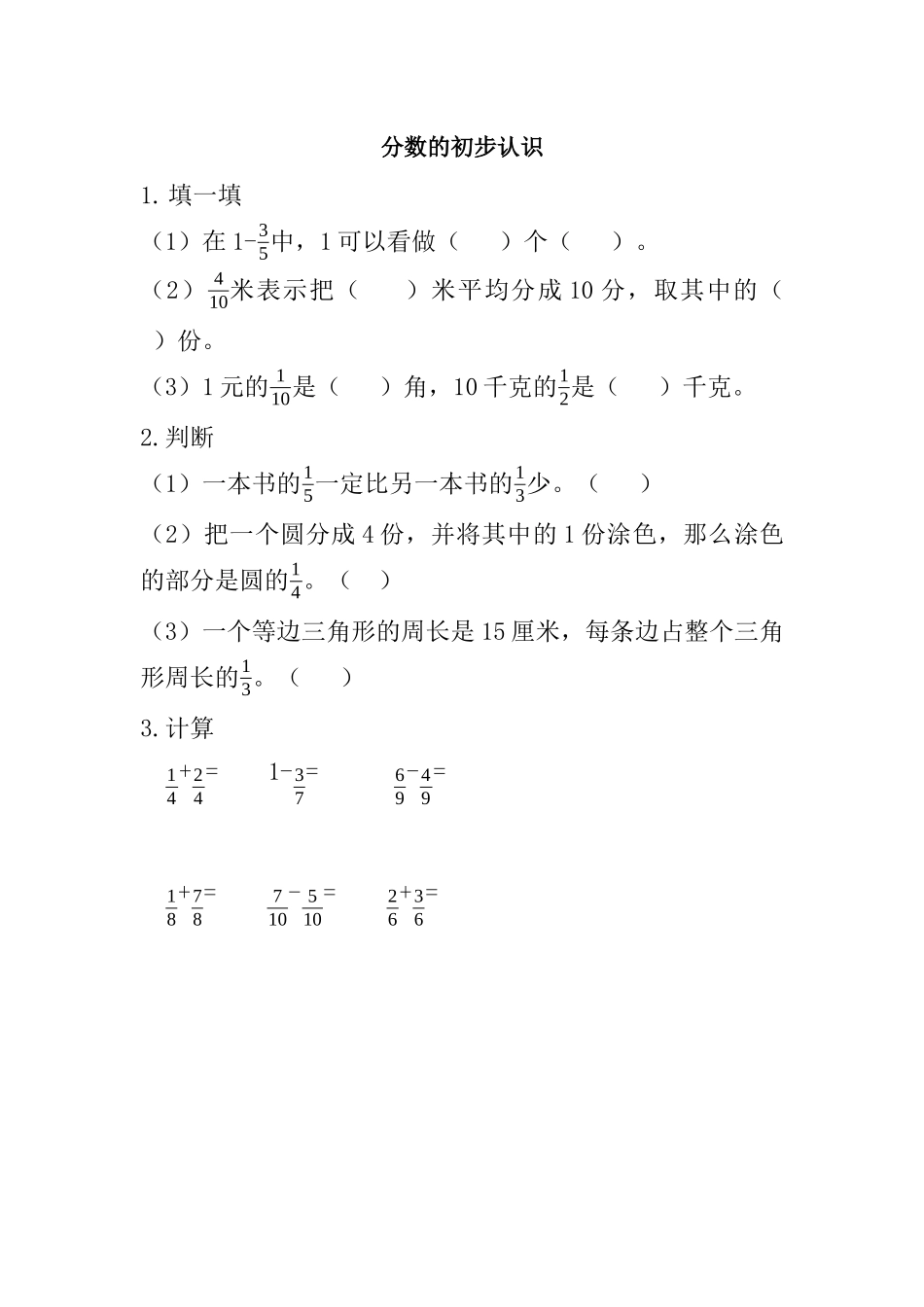 分数的初步认识1.填一填(1)在1-35中,1可以看做()个()。(2)410米表示把()米平均分成10分,取其中的()份。(3)1元的110是()角,10千克的12是()千克。2.判断(1)一本书的15一定比另一本书的13少...