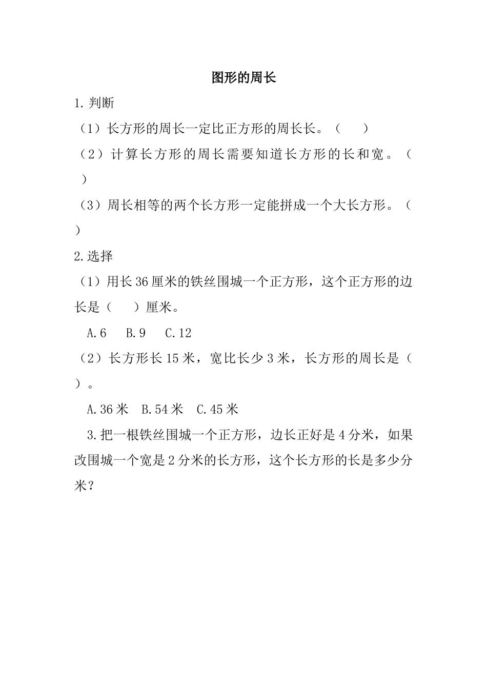 图形的周长1.判断(1)长方形的周长一定比正方形的周长长。()(2)计算长方形的周长需要知道长方形的长和宽。()(3)周长相等的两个长方形一定能拼成一个大长方形。()2.选择(1)用长36厘米的铁丝围城一个...