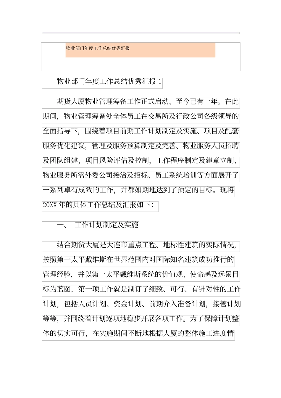 物业部门年度工作总结优秀汇报物业部门年度工作总结优秀汇报1期货大厦物业管理筹备工作正式启动、至今已有一年。在此期间,物业管理筹备处全体员工在交易所及行政公司各级领导的全面指导下,围绕着项目前期工作计...