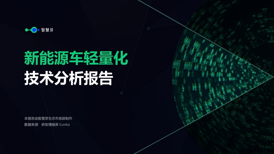 本报告由智慧芽生态市场部制作数据来源:研发情报库Eureka新能源车轻量化技术分析报告1.主要解决技术问题2.技术领域分类3.技术演进路线4.技术效果布局趋势5.技术效果矩阵6.企业分布7.技术方案解读8.关于研发情报...