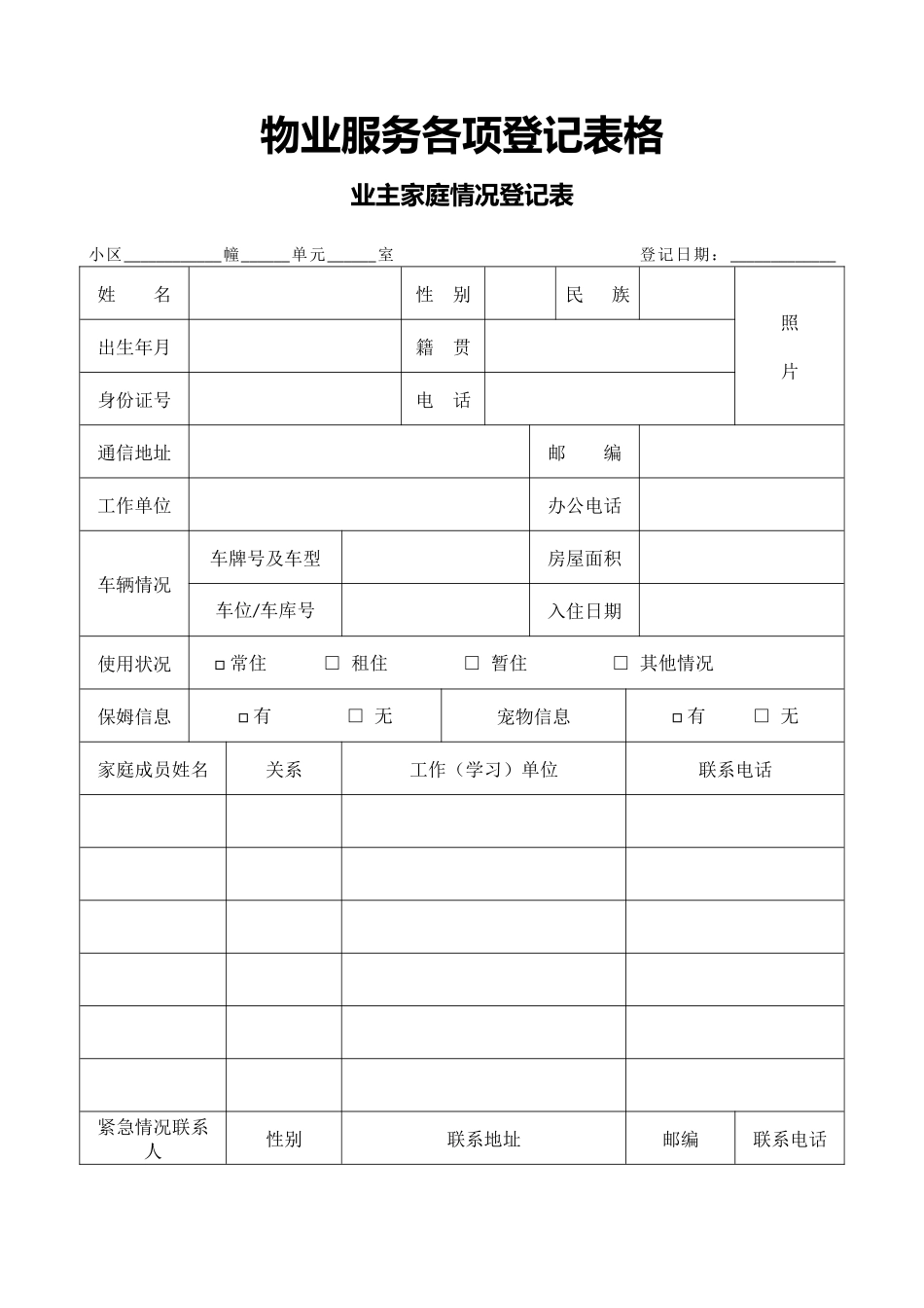物业服务各项登记表格业主家庭情况登记表小区____________幢______单元______室登记日期:_____________姓名性别民族照片出生年月籍贯身份证号电话通信地址邮编工作单位办公电话车辆情况车牌号及车型房屋面积车位...