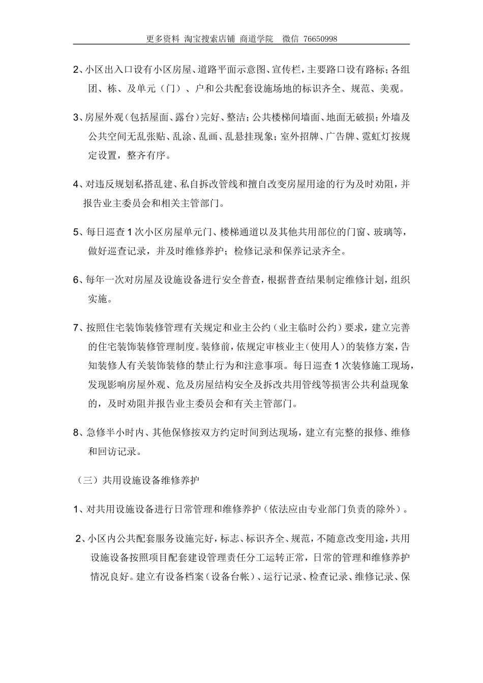 更多资料淘宝搜索店铺商道学院微信76650998物业服务内容及质量标准一级(一)综合服务内容标准:1、根据业主需求,提供物业服务合同之外的特约服务和代办服务等有偿便民服务的,并公示服务项目和服务标准。2、签...