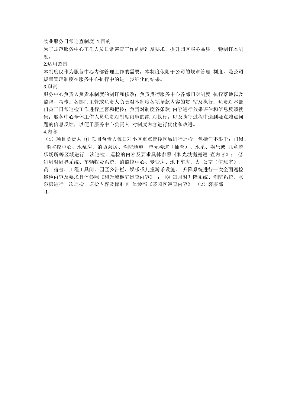 物业服务日常巡查制度1.目的为了规范服务中心工作人员日常巡查工作的标准及要求,提升园区服务品质,特制订本制度。2.适用范围本制度仅作为服务中心内部管理工作的需要,本制度依附于公司的规章管理制度,是公司...